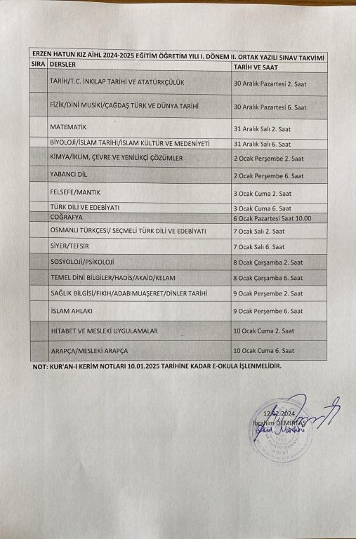 Okulumuzun I. Dönem II. Yazılı Sınav Takvimi yayımlanmıştır. Öğrencilerimize duyurulur